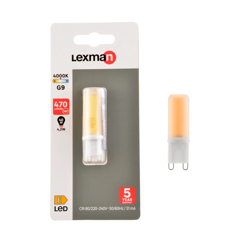 8,30 €Ampoule avec deux broches plates (pour certains plafonniers ou appliques, petits spots, lampes de table) (Culot G9). La température de couleur est de 4000 Kelvin, correspond à un éclairage blanc neutre ("lumière du jour"). La puissance de cette ampoule est de 470 Lumens, soit 40W restitués. Elle consomme 4.2W. Cette ampoule est garantie 5 ans.