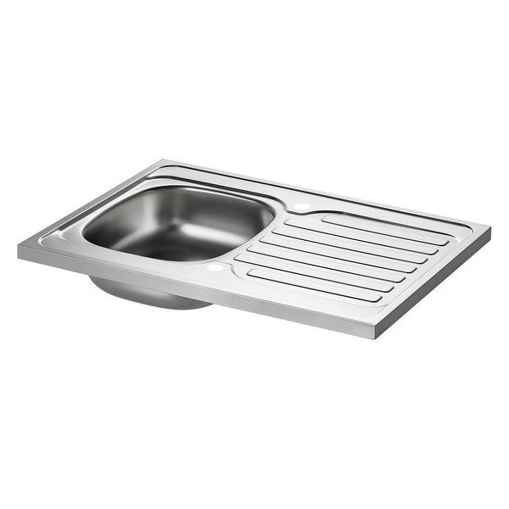 10,40 €L'évier à poser 1 bac et 1 égouttoir en inox Kama convient pour une installation facile sur un meuble de 45 à 80 cm de largeur sans avoir besoin de plan de travail pour le supporter. Réversible, l'égouttoir peut être placé à gauche ou à droite de la cuve grâce aux 2 trous déjà percés pour installer le robinet. Il est facile à nettoyer grâce à sa surface lisse et hygiénique offerte par l'acier inoxydable. Conformément à la réglementation EN 13310, l'évier est résistant à la chaleur. Durable : il résiste également aux chocs. Le système de vidange et le siphon ne sont pas inclus mais disponibles en service plomberie. Evier avec valve de retenue 2" et débordement, avec les coins soudés et polis. Vidage non inclus