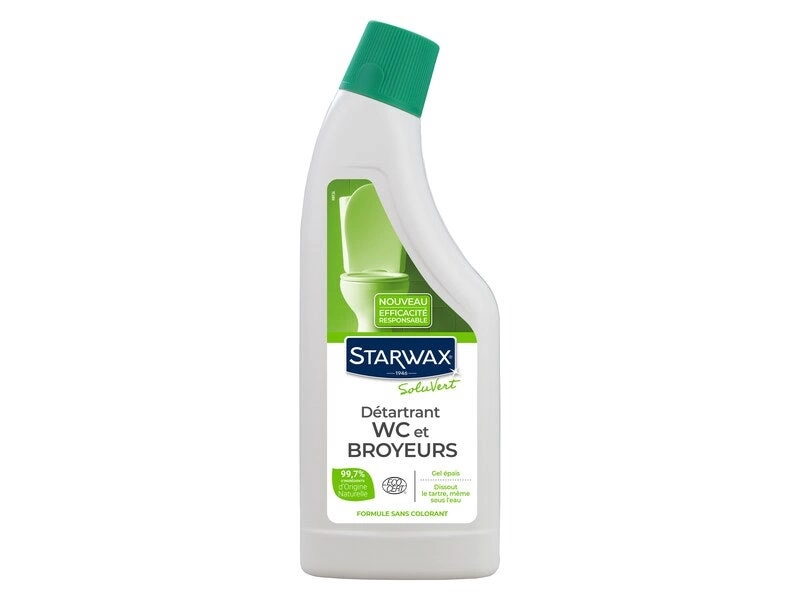 Type de produit : Idéal pour dissoudre les dépôts de tartre dans les WC et WC broyeurs, même sous l'eau Gel épais adhère aux parois pour détartrer en profondeur Détartre le fond de la cuvette grâce à son gel qui se concentre sous le niveau d'eau sans se diluer Formule sans colorant qui contient 99,7% d'ingrédients d'origine naturelle, certifiée par Ecocert Sans danger pour les fosses septiques, et utilisable dans un WC broyeur Parfum menthe laisse une odeur de frais et de propre