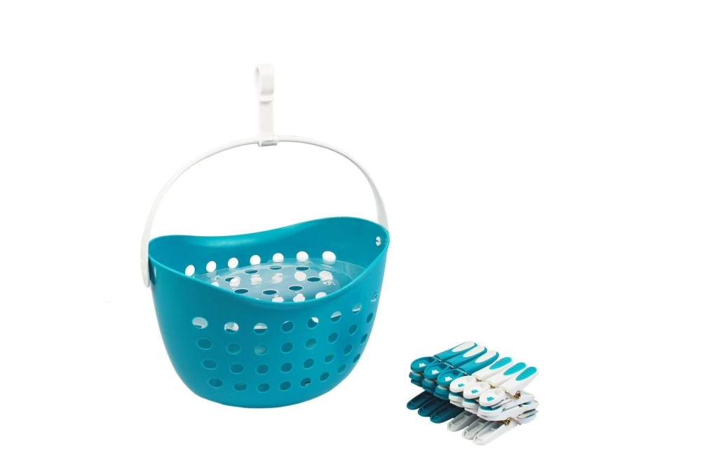 Lot de 12 pinces à linge fleur et son panier en polypropylène, H.14 X P.17 cm bleu