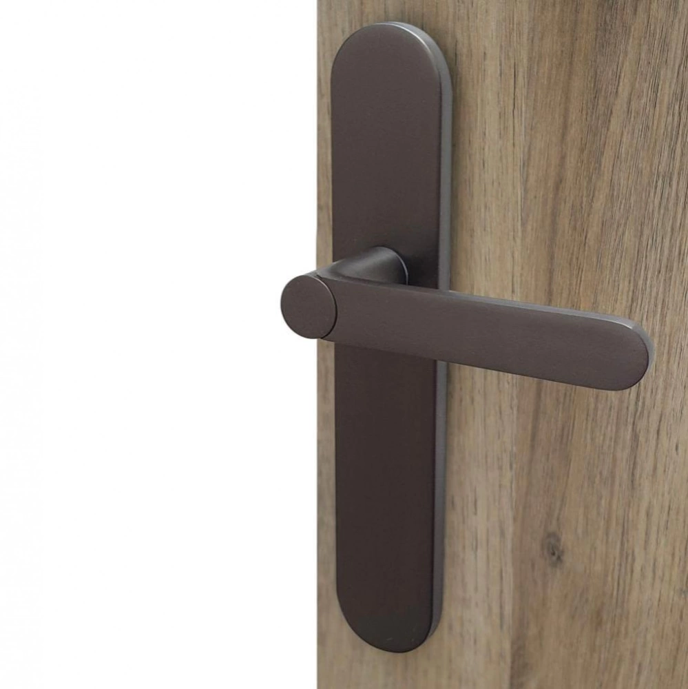 Cet ensemble de poignées de porte sur plaque modèle MEUDON-K a un perçage bec de cane. Il est en aluminium et acier et a une finition canon de fusil. La poignée est assemblée avec un ressort de rappel, qui replace automatiquement la poignée à l'horizontale. Le système de montage des poignées de porte sur plaque EASY-K est une innovation française brevetée et révolutionnaire. Il possède de nombreux avantages, tels que recouvrir les anciens trous et traces, pas besoin de percer la porte, sans vis apparente, ni contrainte d'entraxe de vis. La technologie du brevet MeudonK n’est pas adaptée aux menuiseries aluminium (sauf à faire des empreintes de trous afin que les griffes puissent se positionner). Le MeudonK est prévu pour les portes intérieures et non préconisé pour une porte d’entrée.
