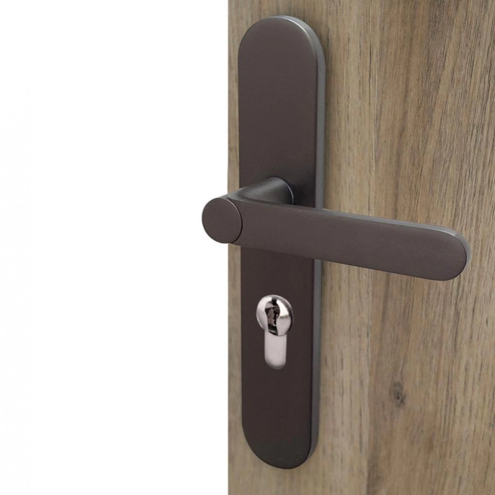 Cet ensemble de poignées de porte sur plaque modèle MEUDON-K a un perçage cylindre. Le montage sans ressort de rappel de la poignée sur la plaque cylindre est compatible avec les serrures 3 points. Il est en aluminium et acier et a une finition canon de fusil. Le système de montage des poignées de porte sur plaque EASY-K est une innovation française brevetée et révolutionnaire. Il possède de nombreux avantages, tels que recouvrir les anciens trous et traces, pas besoin de percer la porte, sans vis apparente, ni contrainte d'entraxe de vis. La technologie du brevet MeudonK n’est pas adaptée aux menuiseries aluminium (sauf à faire des empreintes de trous afin que les griffes puissent se positionner). Le MeudonK est prévu pour les portes intérieures et non préconisé pour une porte d’entrée.